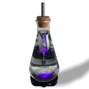 La bottiglia Vortex è realizzata a mano in vetro borosilicato (Boro 3.3), resistente al calore e durevole. La forma è progettata per favorire un vortice stabile e valorizza gli effetti visivi della luce LED (proiezione del Fiore della Vita in base a movimento e illuminazione).